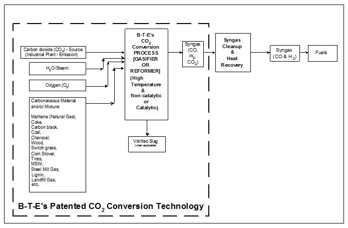 Alternative proprietary patented processes, both non-catalytic process as well as a catalytic process, have been developed for mitigating CO2 emissions which solidifies the aims of both parties, i.e., industry and government. Both processes, the “non-catalytic” process and the “catalytic” process by B-T-E were developed for mitigating CO2 emissions from industrial plants by conversion to fuels. B-T-E’s patented CO2 conversion processes convert CO2 into Syngas (CO & H2) with further conversion to fuels such as Gasoline, Diesel, Jet Fuel, Hydrogen, Methanol, and/or Ethanol with established mature technologies. The patented technology for the conversion of CO2 to Syngas was developed by B-T-E and has seven (7) U.S. patents, one (1) Japanese patent, European Patent (EP) patents, one (1) India patent, one (1) Brazil patent, and other patents pending. B-T-E’s proprietary “catalytic” technology is referred to as the patented SMR+® process.