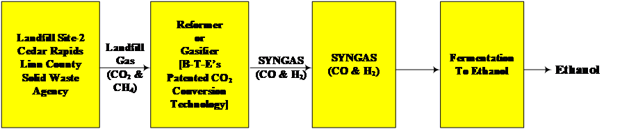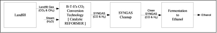 Bio-Thermal-Energy, Inc. (B-T-E, Inc.) has developed a Patented CO2 Conversion Technology which can be used to convert Landfill Gas (CO2 & CH4) into Syngas (CO & H2) which is further fermented, using a well-established commercial process, to Ethanol. The process is simply illustrated as: