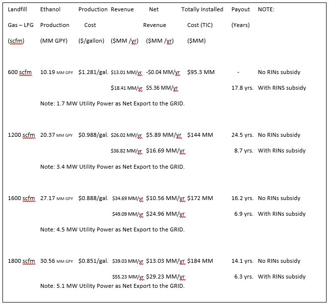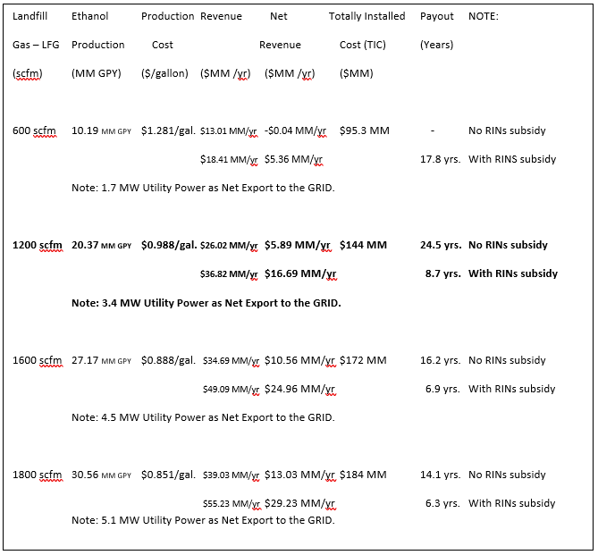 As another example of the economics of a Landfill using B-T-E’s Patented CO2 Conversion Process for the conversion of Landfill Gas (LFG) to Ethanol, such as at the CRLCSWA Landfill site-2. From the table above at Landfill Gas LFG rate of 1600 scfm, Ethanol production is 27.17 MM GPY at a Production Cost of $0.888/gallon. Revenue is $34.69 MM/year and Net Revenue is $10.56 MM/year. Capital is $172 MM (TIC, Totally Installed Cost) at 6% for 20 years. Payout is 16.2 years with no subsidy considered (no RINs). With a subsidy considered, Revenue is $49.09 MM/year and Net Revenue is $24.96 MM/year with payout of 6.9 years. Note, 4.5 MW Utility Power is available as Net Export to the GRID.