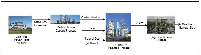 Figure below provides a pictorial representation of the B-T-E technology as used for the conversion of CO2 emissions from a representative coal-fired power plant (790 MW) to gasoline, with an estimated production of 137,200 barrels/day using B-T-E’s SMR+® “Catalytic” Technology.